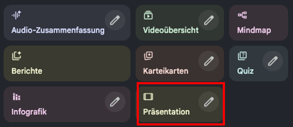 3: Bitte NotebookLM dir ein Präsentations-Deck zu erstellen oder nutze das Studio, um dir eine Präsentation entwerfen zu lassen. Hier kannst du dir auf Basis deines Inputs neben Präsentationen auch andere Inhalte generieren lassen (z.B. Audio-Zusammenfassungen, Karteikarten oder Infografiken) - siehe Screenshot.